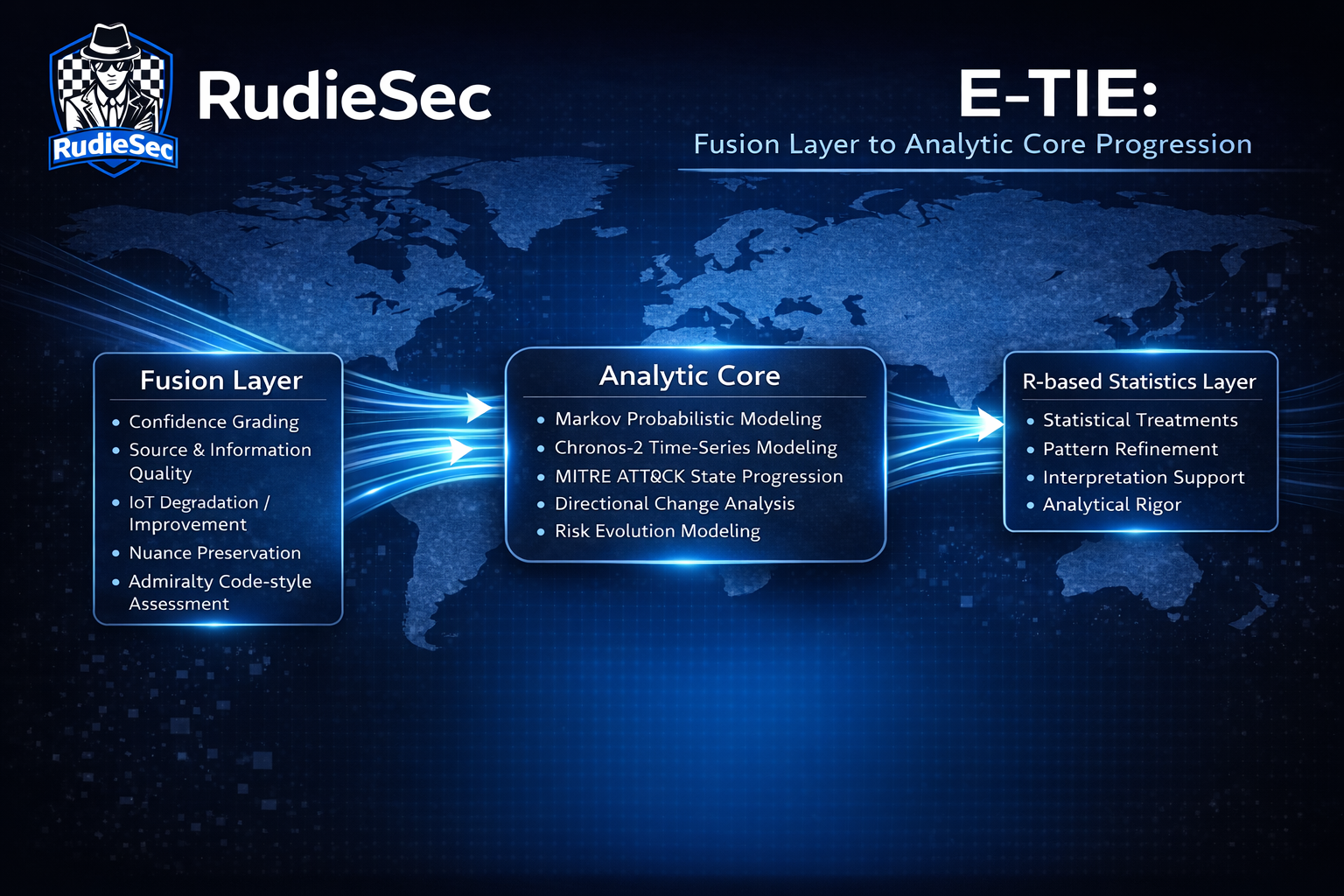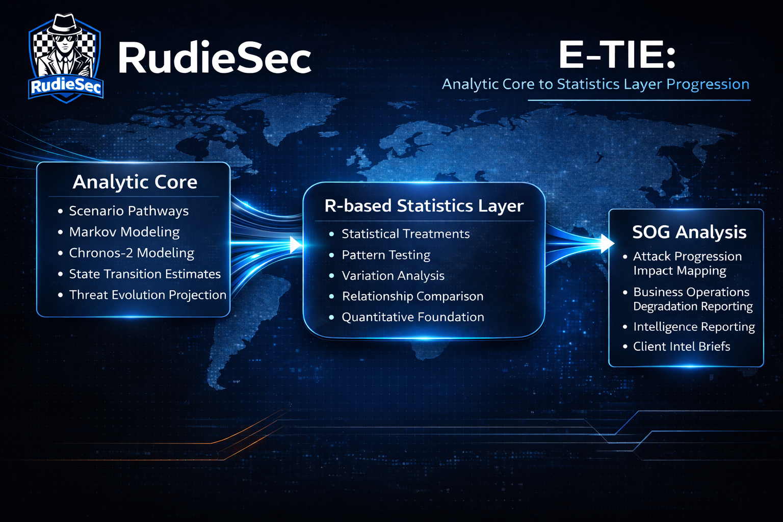 The Analytic Core takes the refined intelligence emerging from the Fusion Layer and advances it through E-TIE’s central modeling components. Markov-based probabilistic modeling and Chronos-2 time-series modeling are applied here to examine how threat activity behaves across time, conditions, and shifting patterns of relevance. MITRE ATT&CK defines the attack progression states used within the Markov model, anchoring quantitative/probabilistic analysis to a structured view of adversary behavior. This allows the system to model movement, estimate directional change, and develop a more structured understanding of how observed risk may evolve. From there, selected outputs move into the R-based Statistics Layer, where additional statistical treatments help sharpen interpretation and reinforce analytical rigor.
