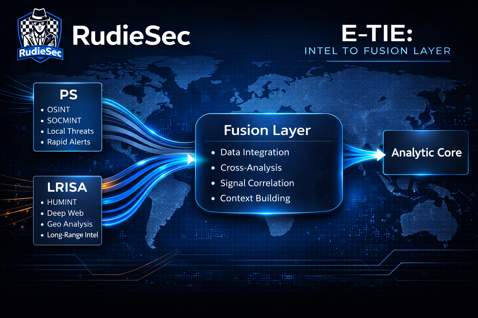 Perimeter Scouting (PS) and Long Range Intelligence Support Activities (LRISA) operate as simultaneous external collection paths within the system intelligence process. They do not serve the same range or purpose, but they do work in parallel. Together, they collect externally derived intelligence across multiple streams, including OSINT, HUMINT, and SOCMINT. Given its longer-range focus, LRISA also extends collection into less visible and harder to monitor areas of the external threat environment. This gives RudieSec both a closer, client-bound view, and a wider view of the external threat landscape.