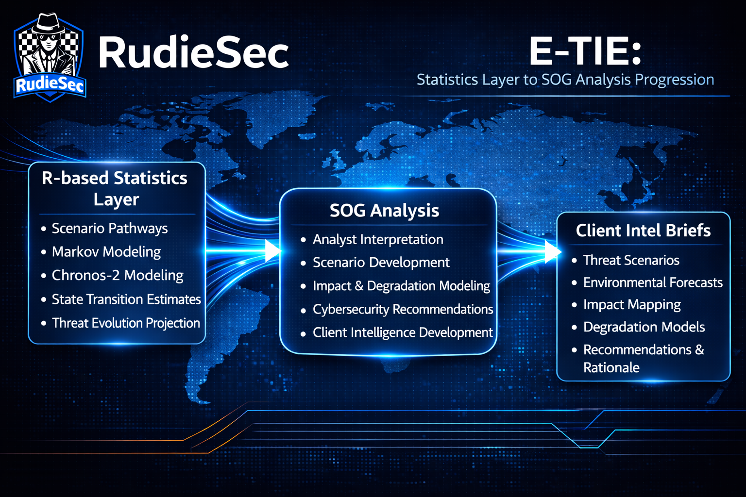 The Analytic Core progresses fused intelligence into scenario-based pathways. Markov and Chronos-2 do more than help describe what has already been observed. Together, they allow E-TIE to model possible directions of development, estimate how threat activity may transition from one state to another, and forecast how those transitions may unfold over time. This creates a more forward-leaning, proactive analytical deliverable, deliverable outputs that can be compared, stress-tested, and carried forward into the R-based Statistics layer for deeper quantitative examination.